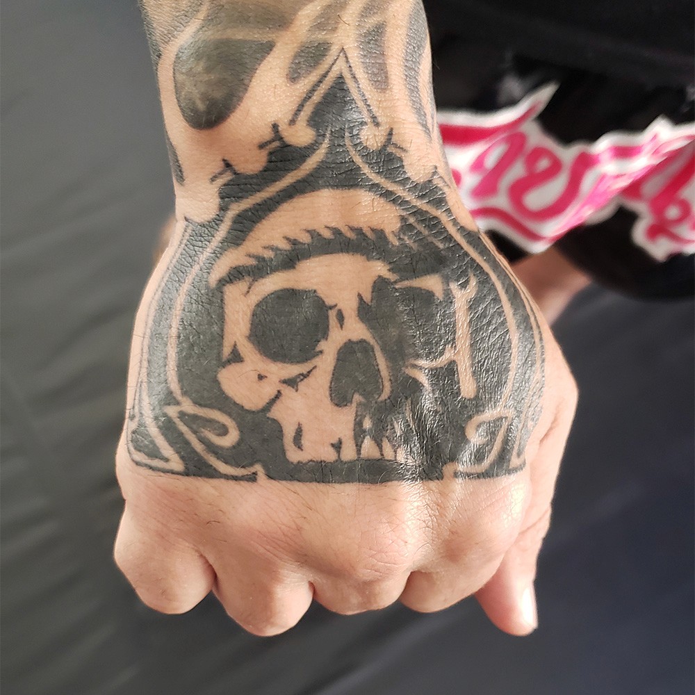 Mauro evidences fondness for skull designs through his related tattoos. Based on that, I created a sketch featuring a skull with a mongkol — a very traditional headband worn by thai athletes before their fights.